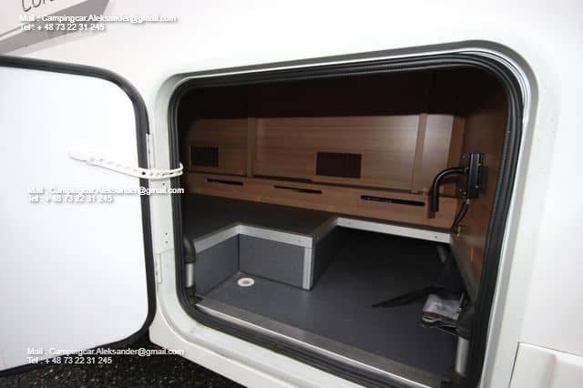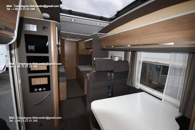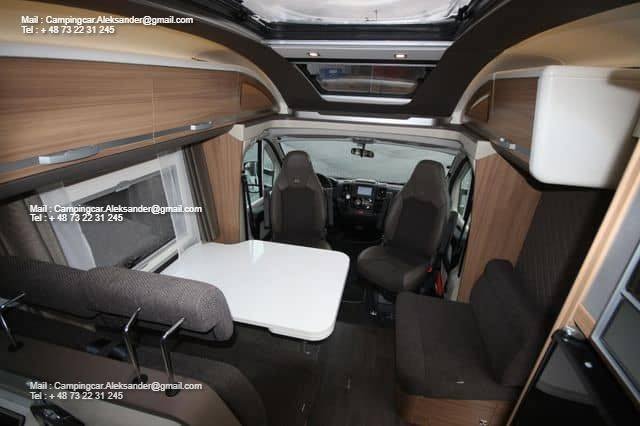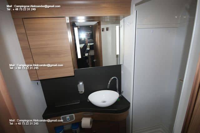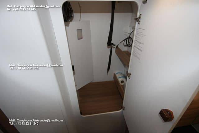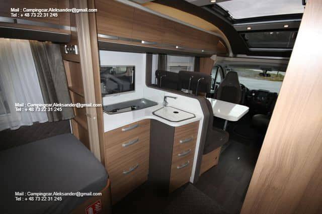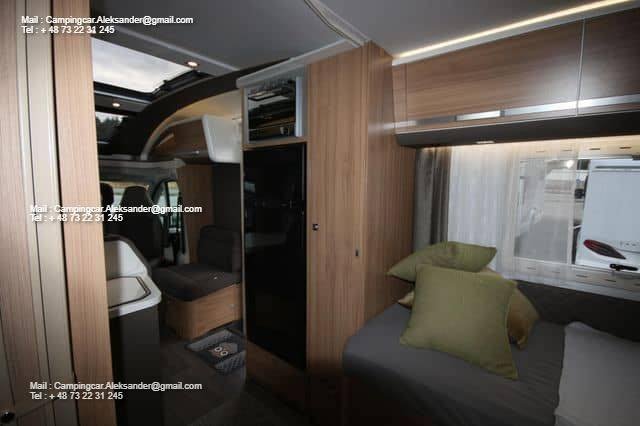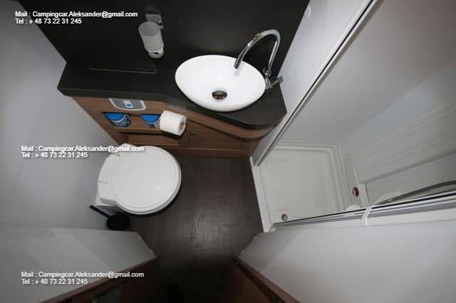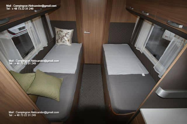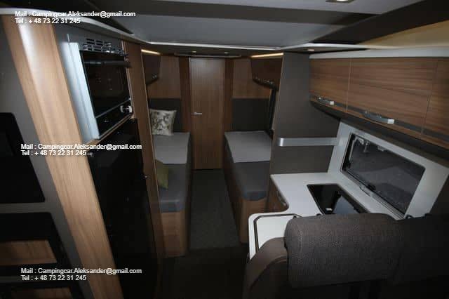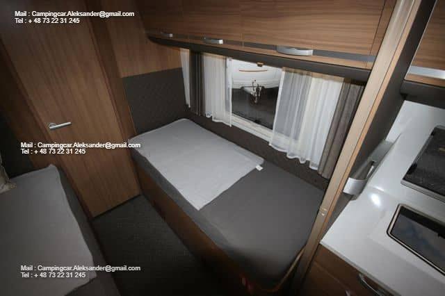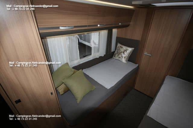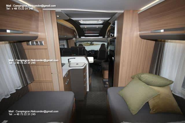 Ce véhicule dispose d’une belle zone de sièges avec des fauteuils réversibles pour le conducteur et une fixation intelligente pour la télévision dans l’armoire près de la porte. Cuisine d’angle avec évier et équipements de cuisson, grand réfrigérateur. Deux lits simples bas facilitent l’entrée et la sortie des lits, et il y a de l’espace de chargement sous les deux lits. Salle de bain spacieuse à l’arrière avec salle de douche attenante et armoire.