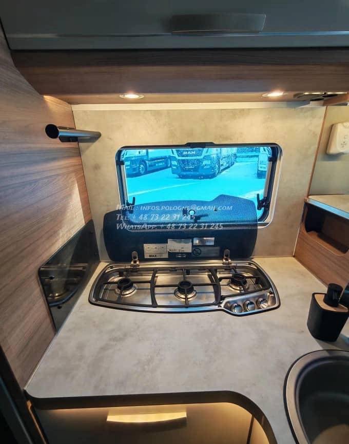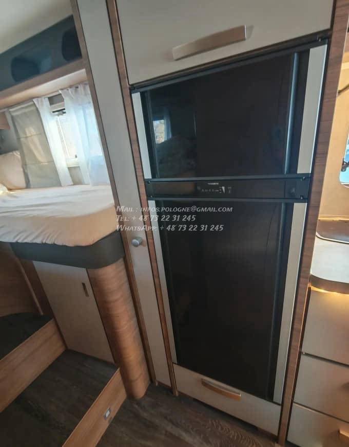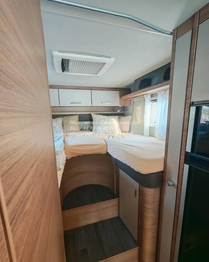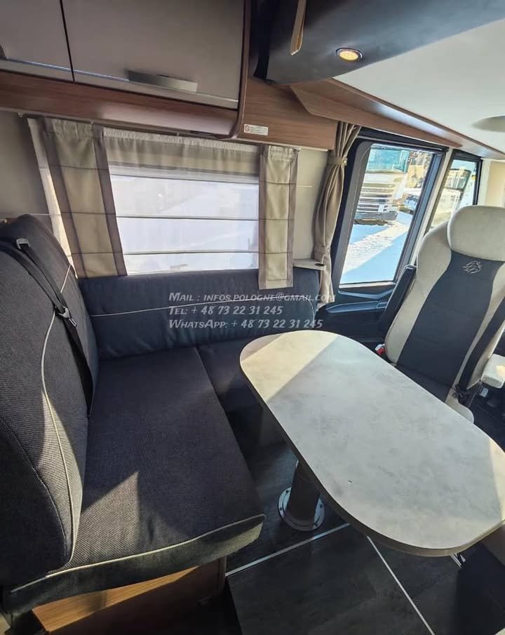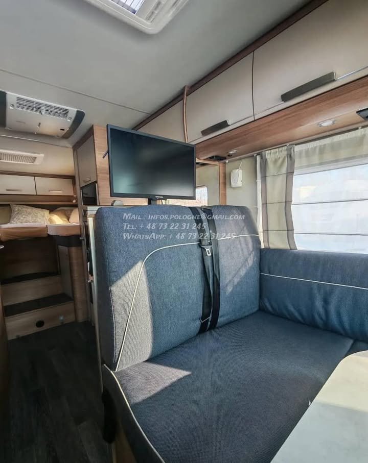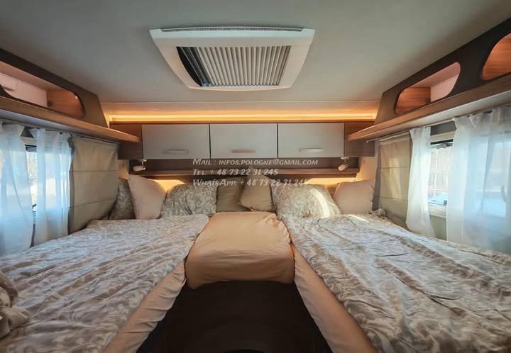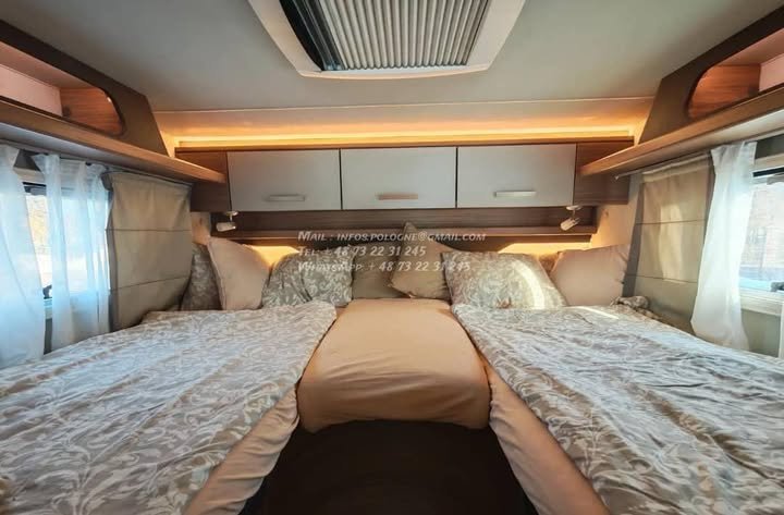 Un modèle haut de gamme, spacieux et parfaitement équilibré, idéal pour les longs voyages en couple ou en famille, avec lits jumeaux confortables, grande soute et excellente tenue de route.