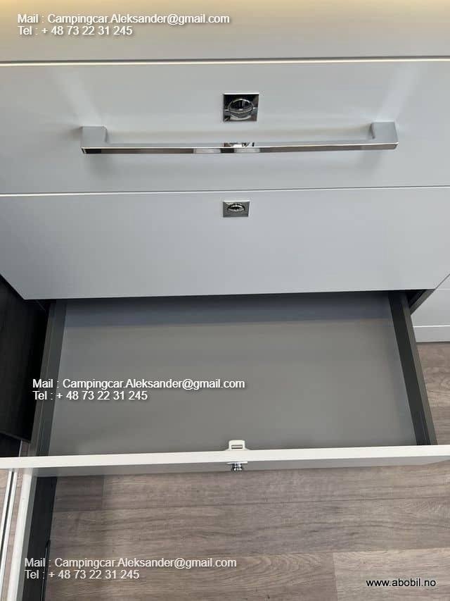 Le Mileo 268 combine deux lits simples à l’arrière et une solution face à face dans le salon. Le lit arrière peut facilement être converti en un grand lit double en tirant le panneau central. Il y a également des escaliers qui montent au lit et qui peuvent être tirés. Lorsque l’escalier est rétracté, il fait office de trappe que l’on peut facilement ouvrir pour accéder au garage. Une solution ingénieuse.