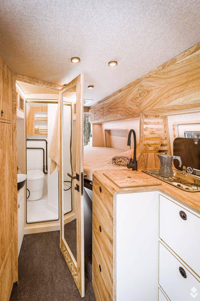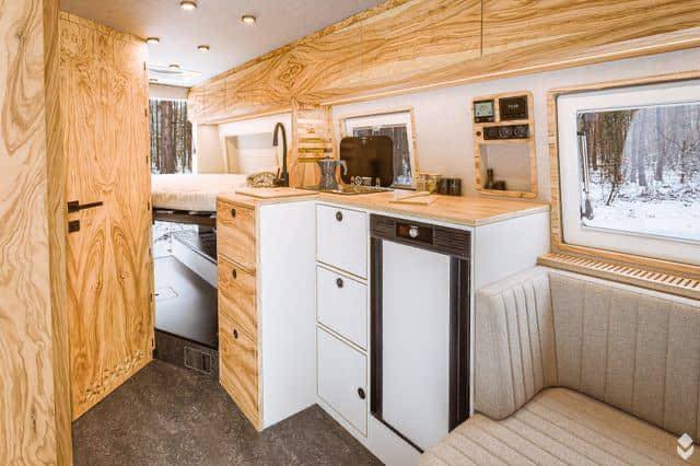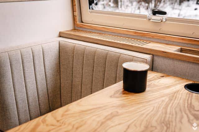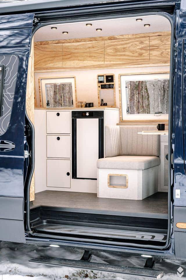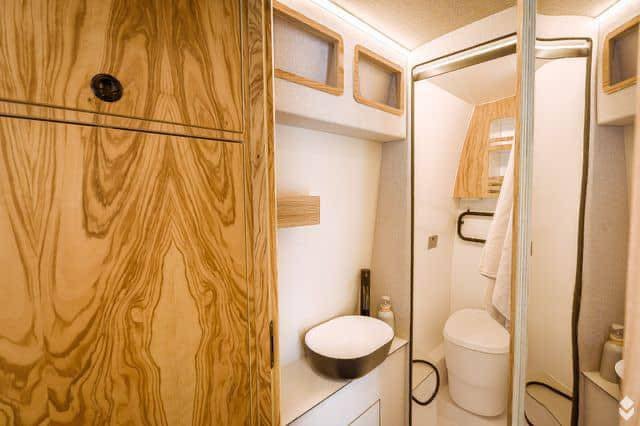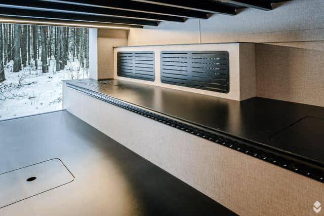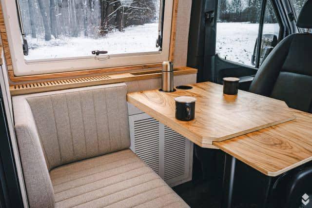La voiture est équipée d’un système de chauffage compact Alde 3030 avec des radiateurs et un chauffage par le sol dans toute la voiture. Ce système fournit également de l’eau chaude à la cuisine et à la salle de bains. Un D4 Eberspracher air-air est installé comme système de chauffage d’appoint. En outre, un échangeur de chaleur « vole » la chaleur de la boucle d’eau de refroidissement de la voiture, ce qui permet de chauffer le moteur ou de conserver la chaleur dans le système Alde pendant la conduite. Le moteur est également équipé d’un réchauffeur d’eau de refroidissement Eberspracher qui agit comme un réchauffeur de moteur et maintient la chaleur dans le moteur de sorte que le système de climatisation délivre un air aussi chaud qu’une voiture à essence même par temps froid et évite les démarrages à froid inutiles.