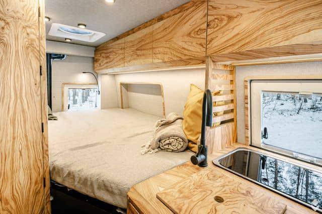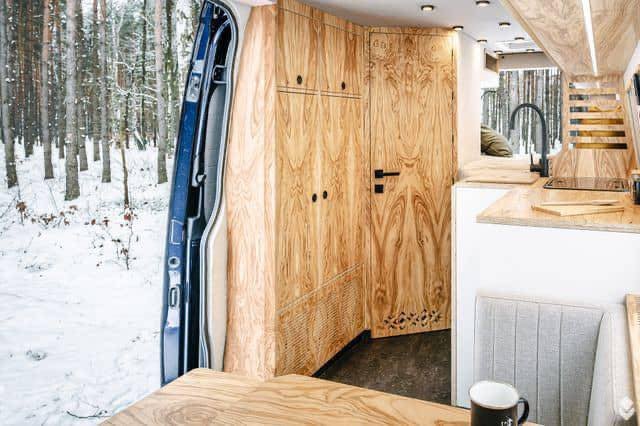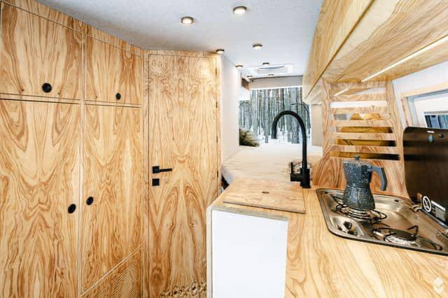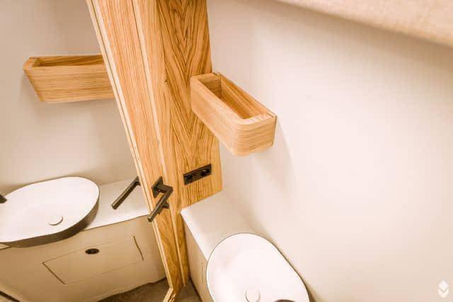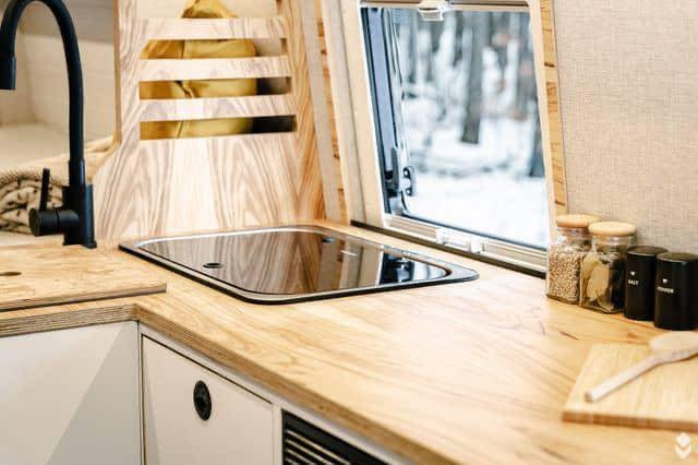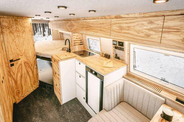 Les réservoirs d’eau douce de 100 litres et d’eaux grises de 100 litres sont installés sur un plancher surélevé dans le « garage » pour éviter les problèmes de gel en hiver. C’est vraiment une voiture pour toute l’année. Il n’y a aucun problème pour y vivre, et il a fait moins 32 degrés à Drevsjø cet hiver sans aucun problème.