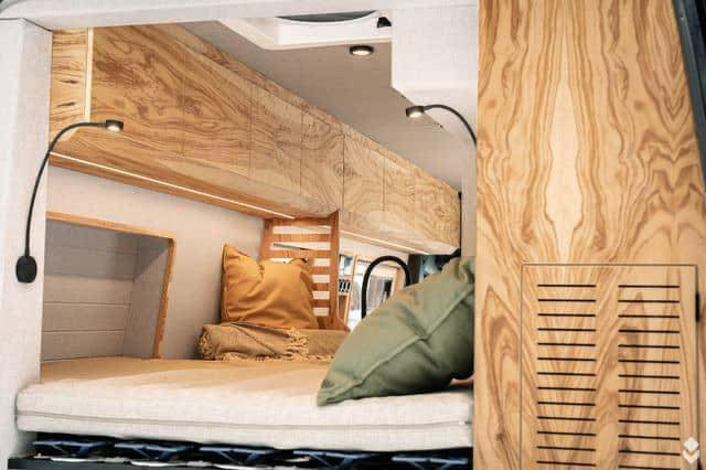 Plusieurs zones d’éclairage dans le salon, la cuisine et la zone de couchage, toutes avec des LED à intensité variable. Lumière supplémentaire à l’extérieur sous l’auvent. Deux liseuses avec prises USB près du lit.