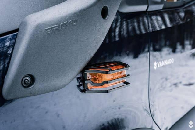 De grands feux auxiliaires de 9 pouces à l’avant et des feux LED plus petits à l’arrière, près de la caméra de recul, fournissent une bonne lumière en marche arrière ou simplement pour éclairer l’espace extérieur.