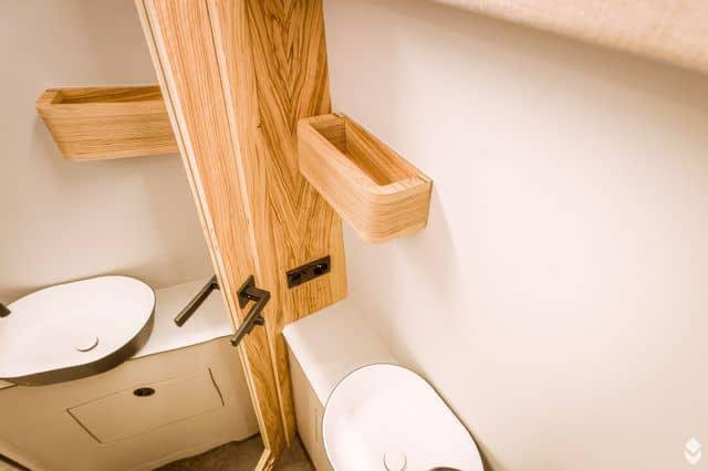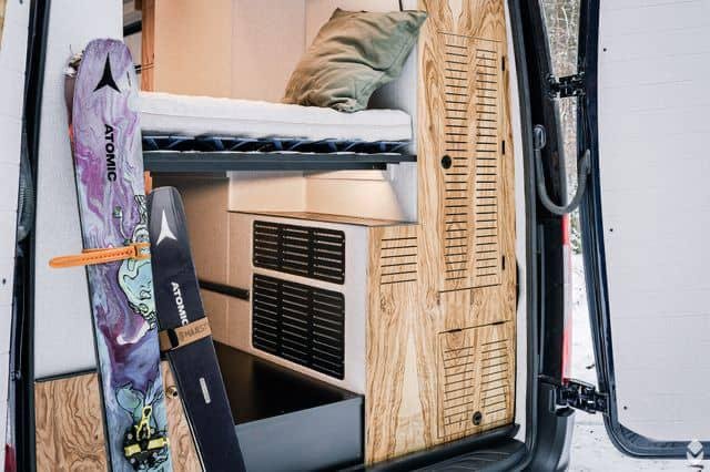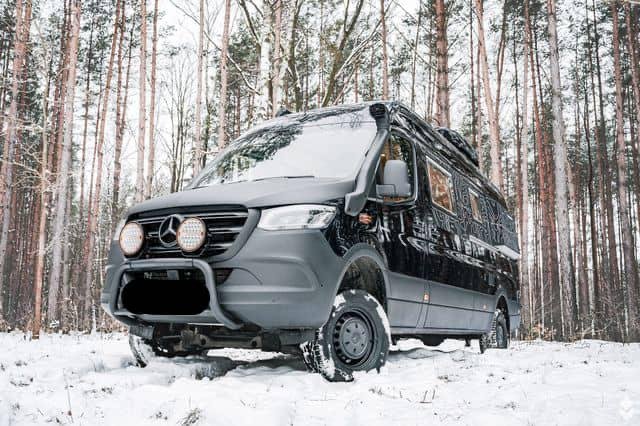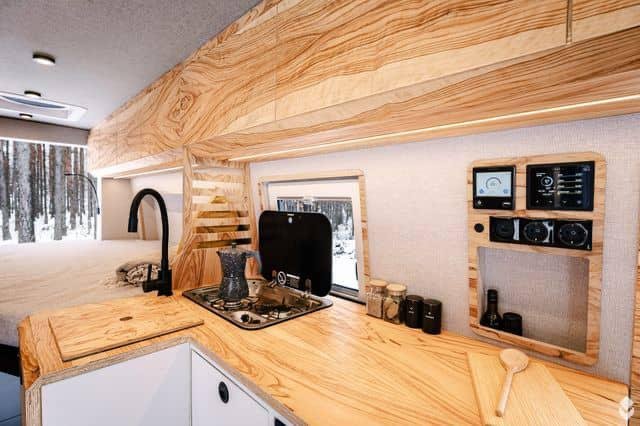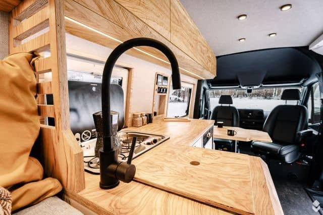 La voiture est équipée d’un système de chauffage compact Alde 3030 avec des radiateurs et un chauffage par le sol dans toute la voiture. Ce système fournit également de l’eau chaude à la cuisine et à la salle de bains. Un D4 Eberspracher air-air est installé comme système de chauffage d’appoint. En outre, un échangeur de chaleur « vole » la chaleur de la boucle d’eau de refroidissement de la voiture, ce qui permet de chauffer le moteur ou de conserver la chaleur dans le système Alde pendant la conduite. Le moteur est également équipé d’un réchauffeur d’eau de refroidissement Eberspracher qui agit comme un réchauffeur de moteur et maintient la chaleur dans le moteur de sorte que le système de climatisation délivre un air aussi chaud qu’une voiture à essence même par temps froid et évite les démarrages à froid inutiles.