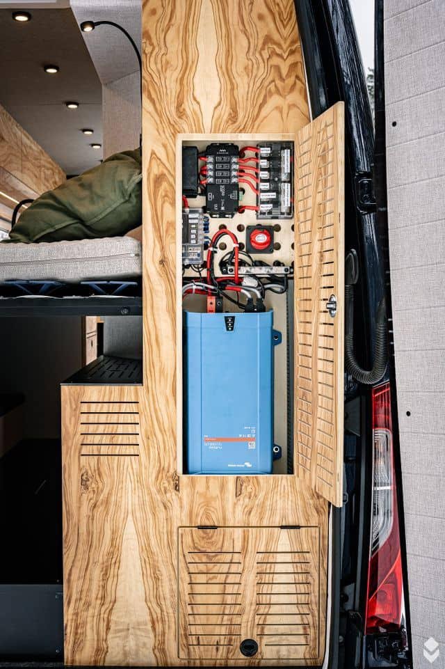 Onduleur de 1300w de Victron, qui fournit une charge de 70A via le courant de quai et un système Victron Oreon qui charge à partir du moteur. Cela signifie qu’une batterie au lithium LIFEPO de 200 ampères peut être chargée par le solaire, le courant de quai et le moteur. La batterie est montée sur des couvertures chauffantes pour une charge optimale en hiver. Tout peut être contrôlé avec l’application VictronConnect.