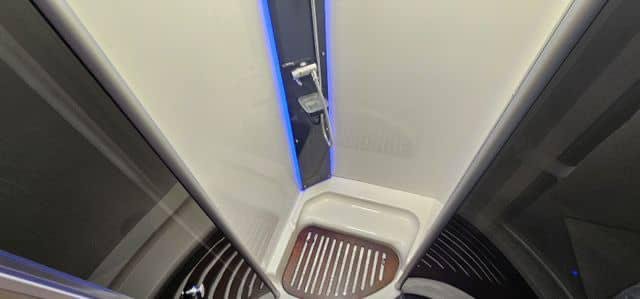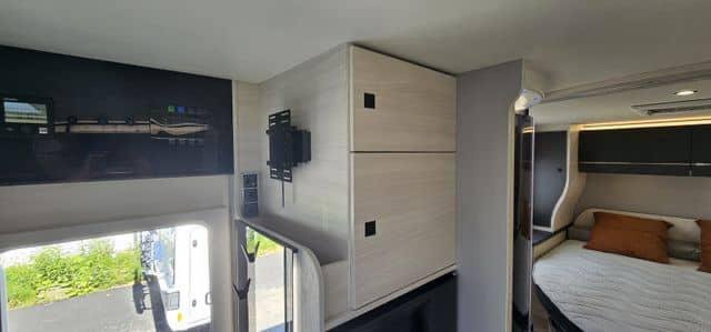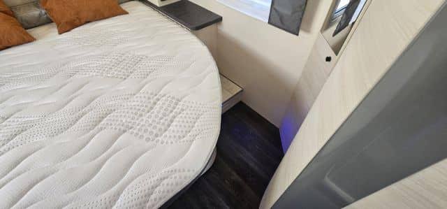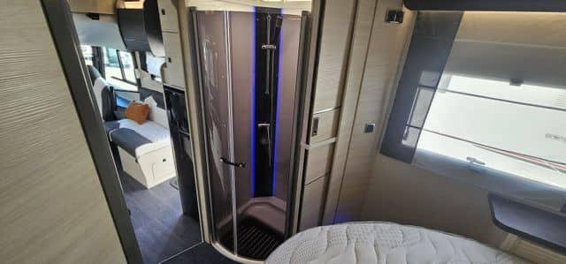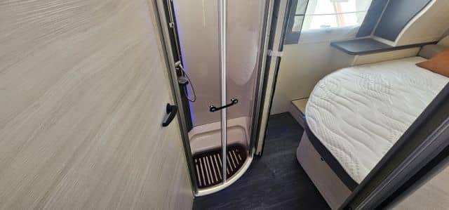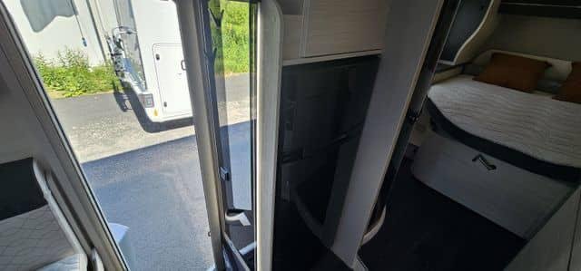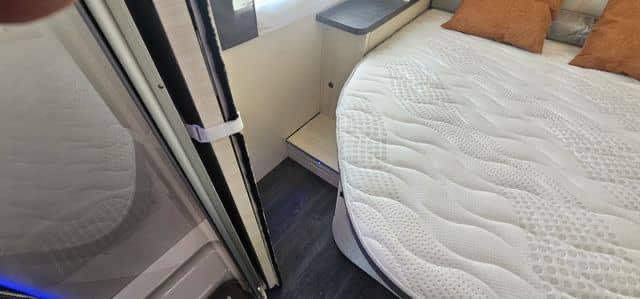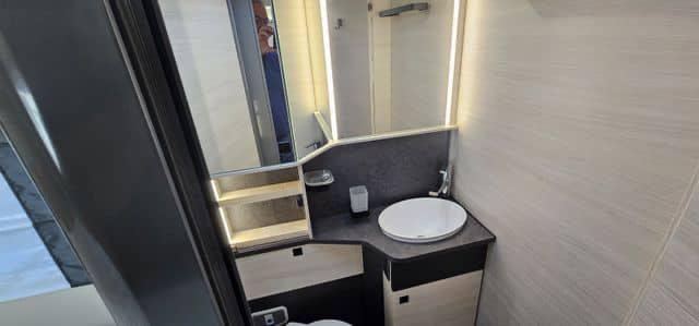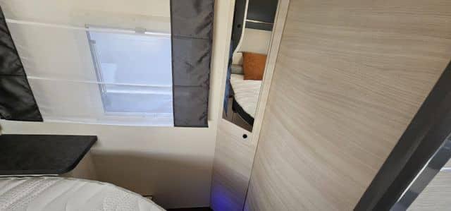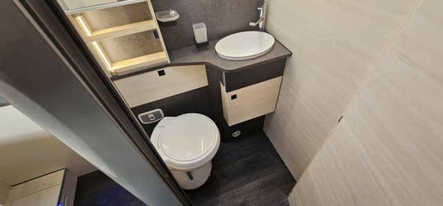 Un autre point important de l’aménagement de ce véhicule est que les toilettes (et le réservoir des toilettes) se trouvent du côté « droit », c’est-à-dire à l’opposé de l’auvent, ce qui évite d’avoir le réservoir des toilettes juste à côté de la table à manger lorsque l’on est assis à l’intérieur.