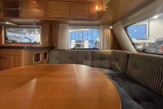 Le coin salon offre un bon confort d’assise. La grande table permet d’inviter facilement des amis à manger dans la caravane.